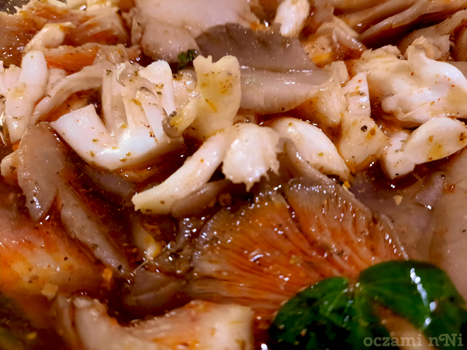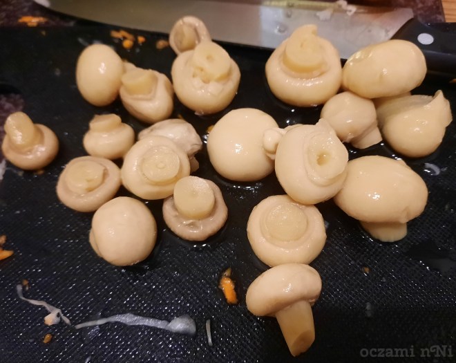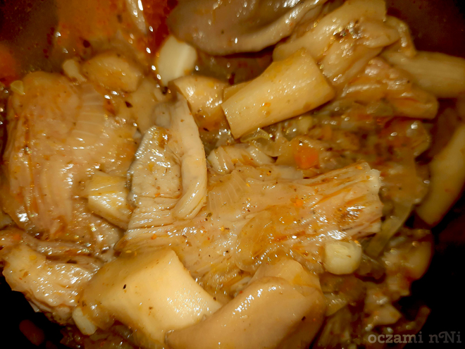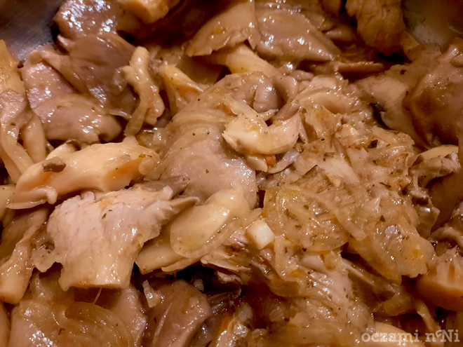 Moja improwizacja na temat ozorków zaczęła się od sosu chrzanowego. Znakomicie gotująca przyjaciółka w pewnej telefonicznej rozmowie przypomniała mi o prostym i pysznym daniu, jakim są jajka w sosie chrzanowym. Po jakimś czasie sama nabrałam na nie apetytu, stwierdzając, że idealnie wpisują się w obecną aurę i poszłam czarować do kuchni. Partner był rezultatem zachwycony, niemal ze łzami w oczach wspominając bary mleczne ze słusznie skądinąd minionej epoki PRL-u. Miałam w planach przygotowanie potrawy dziękczynNej dla Tymona Tymańskiego za jego znakomite „Republikacje” (o których wkrótce napiszę), więc plany te zaczęły się nagle krystalizować. Sos dziękczynNy przygotowałam nieco inaczej niż ten, którego sukces mnie zainspirował. Po pierwsze, dlatego że gotowanie jednej potrawy dwa razy w ten sam sposób mnie nudzi, a zwłaszcza jesienią muszę walczyć z własnym życiem o dopaminę jak lwica, a po drugie… Drugiego w sumie jednak nie ma. Na horyzoncie moich wizji zaczęły majaczyć ozorki, a internet w sugerowaniu ich wegetariańskich zamienNików okazał się nad wyraz bezużyteczny. Pomyślałam więc, że dobra marynata będzie kluczem do sukcesu w kwestii smaku, a do oryginału trzeba zbliżyć konsystencję i wygląd. Boczniaki okazały się wyborem najbardziej oczywistym.