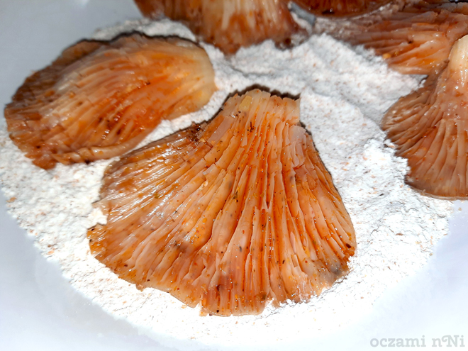 Wyjąć boczniaki z marynaty i osuszyć na ręczniku papierowym. Kiedy wyschną, delikatnie obtoczyć tylko tyle z nich, ile wygodnie zmieści się na patelni, z jednej strony w mące.