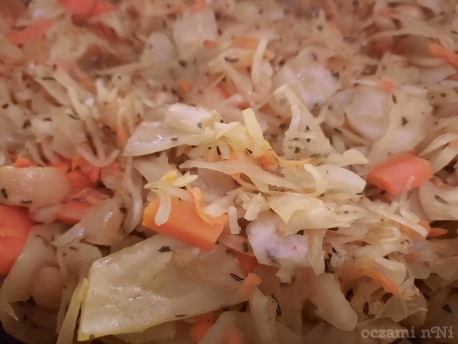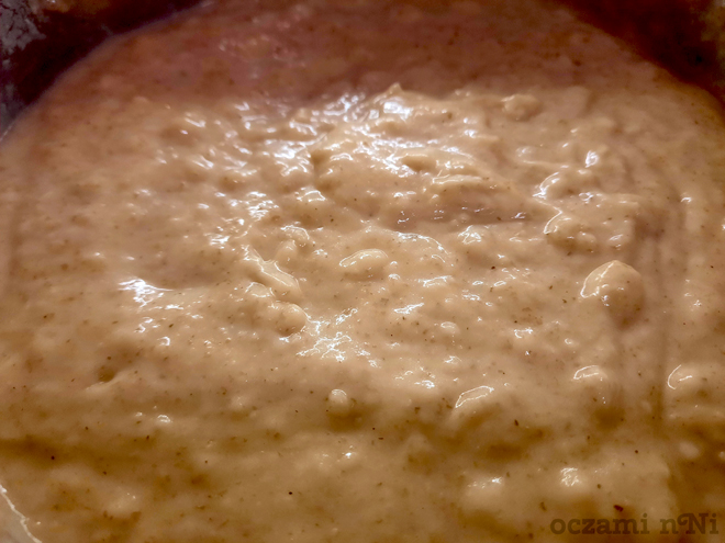 Na tym etapie można oczywiście wrzucić odsączone duszone boczniaki z cebulą do przygotowanego uprzednio sosu chrzanowego. Ja jednak proponuję włożyć je do pustego garnka, w którym zalejemy je tylko połową sosu.