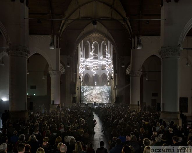 Kiedy już wszyscy weszli do sporych rozmiarów pięknego i ważnego dla Hagi kościoła Grote Kerk, a gwar, rozmowy oraz odgłosy dzwoniących butelek z napojami wyskokowymi ustały, przygasły światła, a z półmroku wyszła na scenę ona – delikatna, drobna, lekko przygarbiona, piękna Laurie Anderson we własnej osobie. Zamarłam. Przez dłuższą chwilę nie mogłam uwierzyć, że to się dzieje naprawdę. Podeszła do skrzypiec i zaczęła na nich grać, a na ekranie pojawiały się zdania – wszystko utrzymane w tej samej konwencji (ten sam font oraz charakterystyczny szaro-biały kolor) co w książkach „Język przyszłości” i „All the Things I Lost in the Flood”, czy na okładce płyty „Landfall”. Grała niezwykle przejmująco i z wielką ekspresją. Ogromne wrażenie zrobiły na mnie wtedy dwie rzeczy: doskonałe oświetlenie (dopasowane do tego, co działo się na scenie, niezwykle wysmakowane, budujące nastrój, dopracowane w najmniejszym szczególe) i idealne nagłośnienie. O ile jeszcze powstaje wiele znakomicie zrealizowanych płyt studyjnych, o tyle przeważnie koncerty, zwłaszcza te tzw. „rozrywkowe” w większości pozostawiają bardzo wiele do życzenia, jeśli chodzi o kunszt realizacji dźwięku. Siedziałam pod sceną, domyślałam się więc, że będzie głośno. Było głośno, czasem nawet bardzo, ale proporcje dźwięków były tak fantastycznie wyważone, że każdy dochodzący do moich uszu dźwięk był zrozumiały i nie zlewał się z żadnym innym.