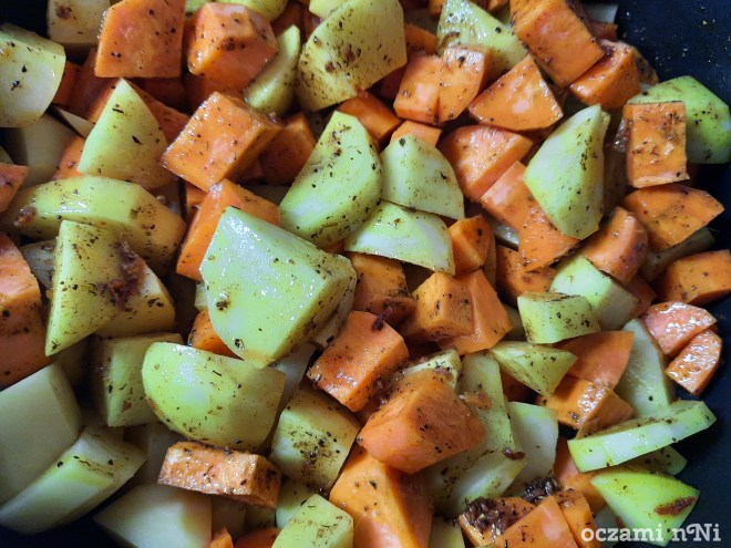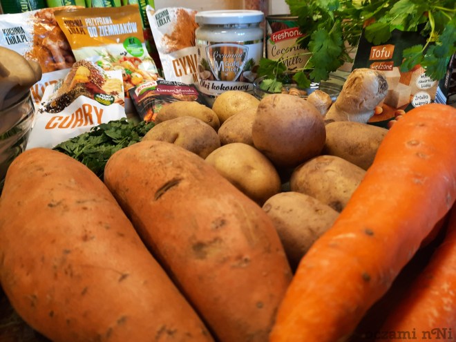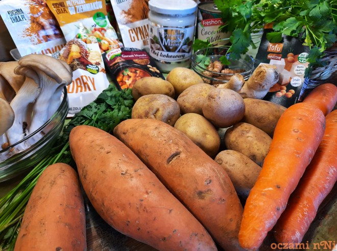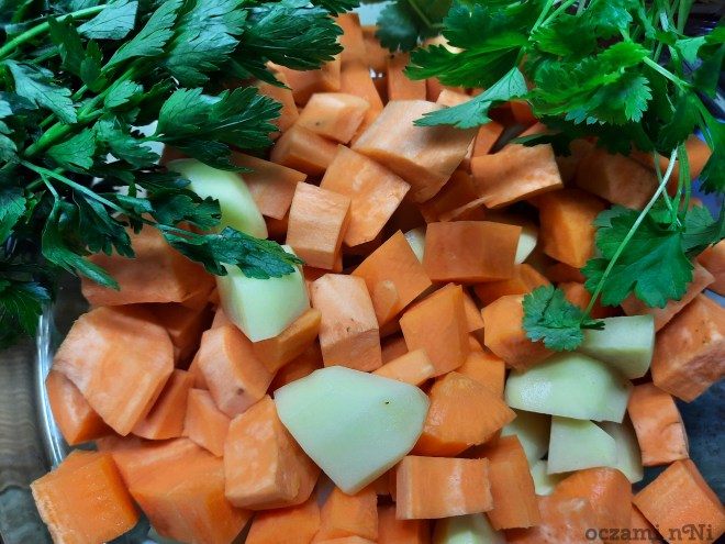 Bataty, ziemniaki i marchewki umyć, obrać i pokroić w kostkę. Umyć natkę pietruszki oraz garść świeżej kolendry i lubczyku, posiekać drobno i dodać do pokrojonych warzyw tylko połowę i natki, i kolendry, i lubczyku. (Drugą dodamy do dania trochę później.) W dużym garnku rozpuścić 2 łyżki oleju kokosowego, a potem dodać do nich trzy starte korzenie kurkumy, starty kawałeczek korzenia imbiru, podpalony na ogniu nieobrany ząbek czosnku oraz pozostałe przyprawy: curry, garam masalę, kurkumę mieloną, cynamon i przyprawę do ziemniaków. Chwilę podsmażyć na niewielkim ogniu, po czym wyjąć czosnek w łupince z garnka i wycisnąć go do niego przez wyciskarkę.
