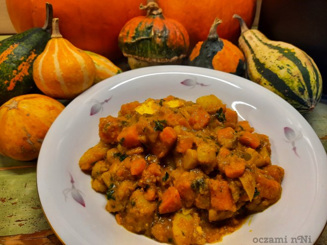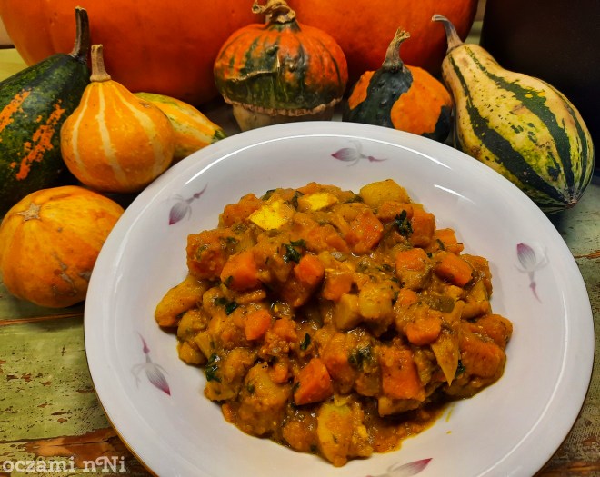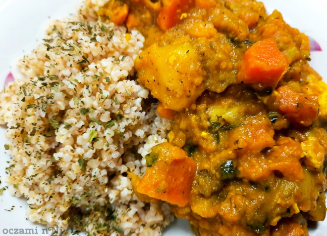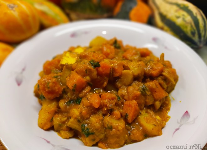 Co tu dużo kryć, przyszła jesień. Dla mnie to czas zaszycia się w górach w moim przytulnym drewnianym domku, którego zaczęło mi nawet odrobinę brakować. Oprócz ulubionego fotela i regału z kolejnymi książkami, które niebawem zamierzam pochłonąć, zakopiański dom to dla mnie przede wszystkim kuchnia (tęskniłam za nią tym bardziej, że nad morzem wspólne gniazdo dopiero wijemy). Po tylu latach ciągle jednopalnikowa, ale nadal inspirująca do kreatywnego działania, a dzięki mojemu nieocenionemu Partnerowi, coraz praktyczniej i wygodniej urządzona. A skoro nadeszła jesień, a ja odzyskałam swoje kuchenNe królestwo, szybko wyczarowałam potrawę na wskroś jesienną, a do tego wegetariańską i – o ile się nie mylę – również wegańską. To smaki bardzo mi bliskie, bo z jednej strony inspirowane kuchnią indyjską, a z drugiej – polską. Delikatne, choć rozgrzewające curry idealnie sprawdzi się zarówno jako pyszny rodzinny obiad, jak i w roli gwoździa programu podczas eleganckiej proszonej kolacji dla bliskich.