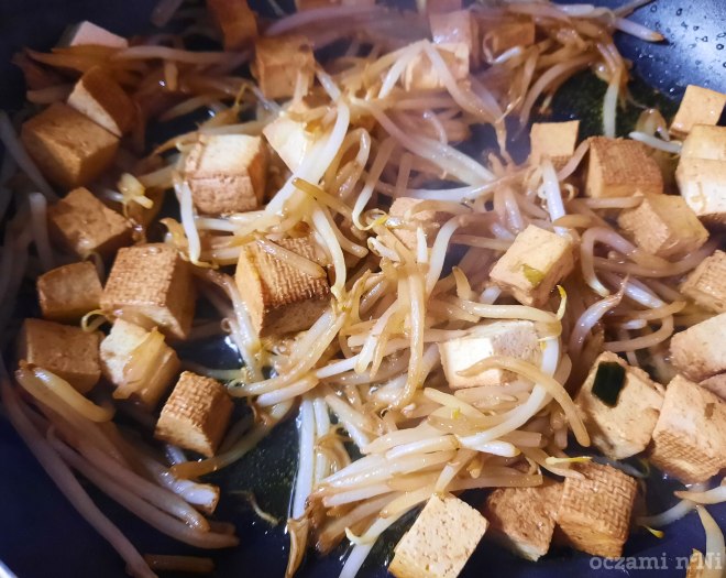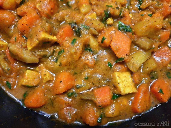 W międzyczasie wymyć boczniaki i pokroić w kostkę. Pokroić również wędzone tofu. Na patelni rozgrzać olej kokosowy, rozpuścić w nim kostkę grzybową i wrzucić boczniaki. Smażyć, aż będą lekko chrupkie. Pod koniec smażenia dodać tofu. Z garnka z warzywami odlać nadmiar sosu (i zachować, jeszcze się być może przyda) i dodać podsmażone boczniaki z tofu, 3 – 4 łyżki mleczka kokosowego, drugą połowę posiekanej natki pietruszki, świeżej kolendry i lubczyku, a także wszystkie sypkie przyprawy jeszcze raz, do smaku. Całość wymieszać i dusić jeszcze ok. 5 minut.