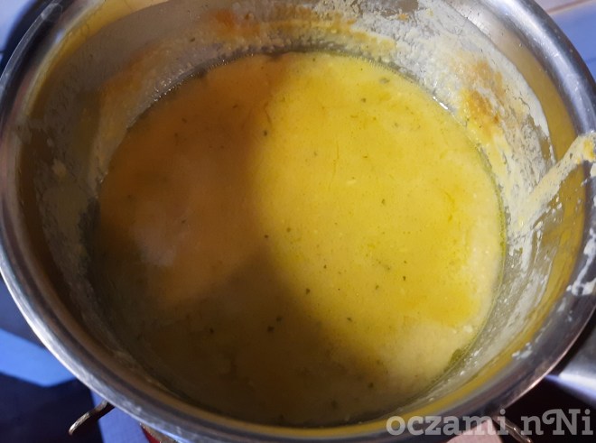 Na tym etapie można oczywiście wrzucić odsączone duszone boczniaki z cebulą do przygotowanego uprzednio sosu chrzanowego. Ja jednak proponuję włożyć je do pustego garnka, w którym zalejemy je tylko połową sosu.
