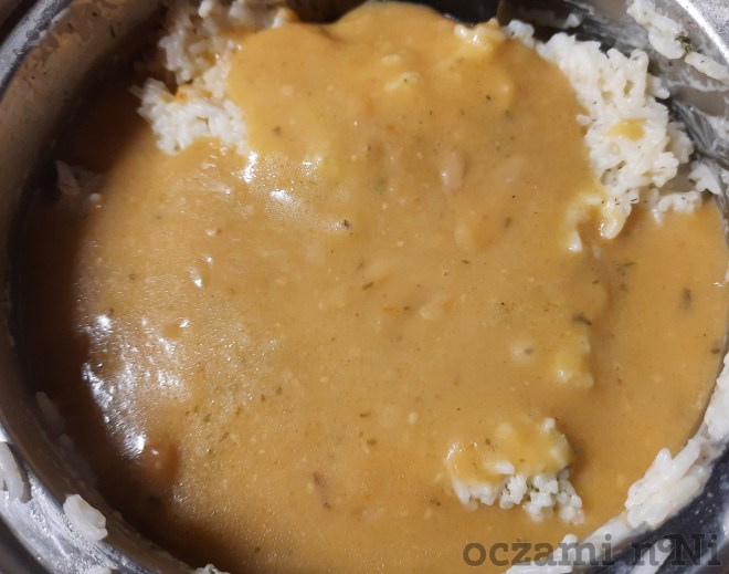 Jeśli nasz psiak lubi napoje typu Psie Piwko, możemy mu, oprócz wody, podać w misce również bulion, który nam został (jeśli po podlaniu ryżu nam oczywiście został), choć nie każdy pies będzie rozumiał taką płynną sytuację. Jeśli wiemy, że takie podanie nie przejdzie, bulion można zamrozić i skorzystać z niego przy gotowaniu następnej karmy.