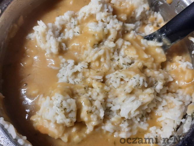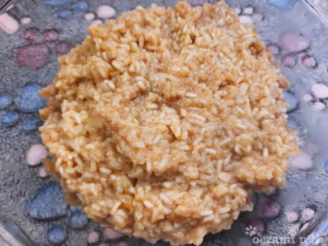 Bulion w garnku doprowadzamy do wrzenia, zmniejszamy ogień i dodajemy 1,5 szklanki ryżu. Ryż gotujemy wg wskazówek na opakowaniu, dodając do tego jeszcze 5 minut, żeby się rozgotował. Co jakiś czas sprawdzamy, czy nie należy ryżu podlać resztą bulionu. Gotowy ryż pozostawiamy do ostygnięcia, a potem łączymy ze zmiksowanymi warzywami i jabłkiem.
