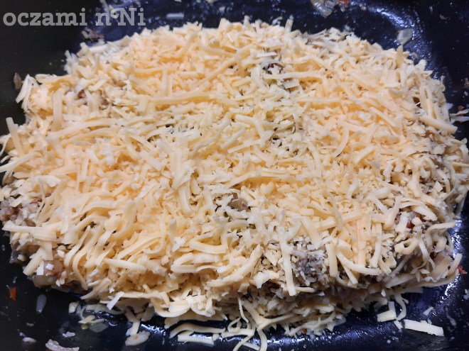 Znowu wszystko porządnie wymieszać i posypać tartym cheddarem.