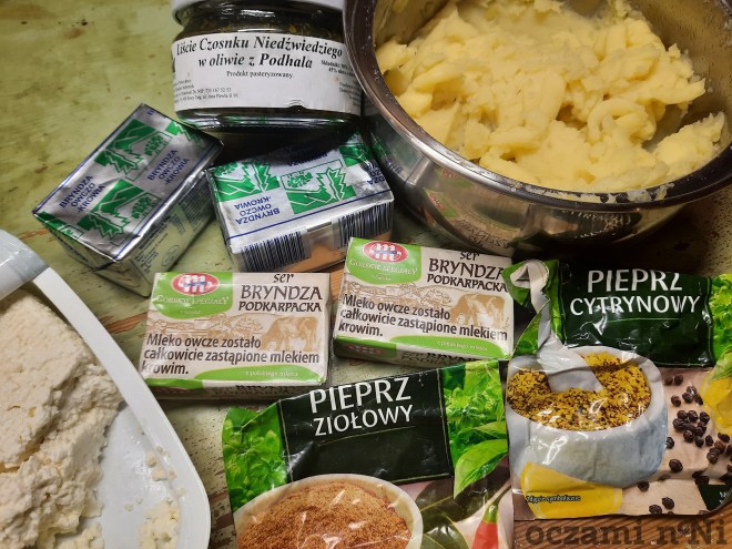 Wczoraj jednak otworzyłam szafkę, z której puścił do mnie oczko słoiczek liści czosnku niedźwiedziego w oliwie zakupiony pod sam koniec Jarmarku Dominikańskiego u moich wspaniałych podhalańskich pracodawców. Uświadomiłam sobie wtedy, że już dawno zamarzyły mi się pierogi z bryndzą i czosnkiem niedźwiedzim własnej produkcji, więc całkiem nawet ochoczo zabrałam się za wymyślanie farszu, a potem lepienie pierogów, na których punkcie mój Partner całkowicie oszalał.*