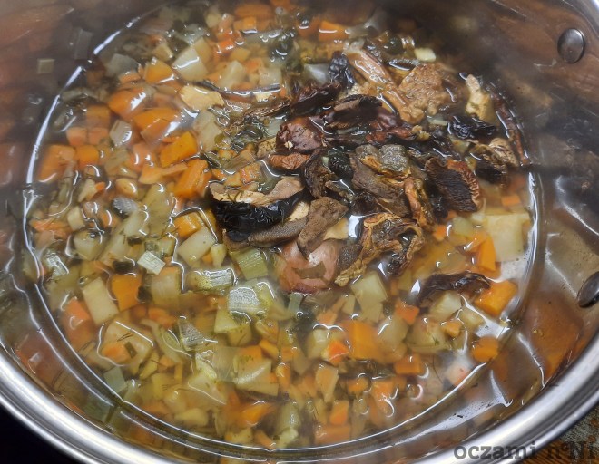 Borowiki namoczyć w miseczce z zimną wodą. Do dużego garnka włożyć mrożoną i suszoną włoszczyznę, zalać je wodą, doprowadzić do wrzenia i zacząć gotować. Cebulę oraz 3 ząbki czosnku opalić z każdej strony ogniem i wrzucić je do garnka. Dodać świeży i suszony lubczyk, ziele angielskie, liście laurowe oraz pieprz. Gotować wszystko na wolnym ogniu ok 30 minut. Po ich upływie wyłowić ziele angielskie, liście laurowe, ziarna pieprzu, cebulę i ząbki czosnku. Ząbki obrać z łupin i wrzucić z powrotem do bulionu. Dodać połowę namoczonych borowików i kostki bulionowe oraz grzybowe. Gotować wszystko jeszcze ok. 10 minut.