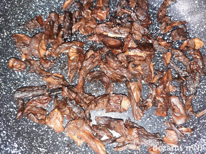 Pokroić cebulę w plastry i rozgrzać oliwę na dużej patelni. Wrzucić na rozgrzaną oliwę zanurzone jedną stroną w mące boczniaki i plastry cebuli, delikatnie i szybko obsmażając z każdej strony, a następnie dodać resztę wysuszonych boczniaków, podlać wszystko zachowanym do tego celu w dzbanuszku bulionem i dusić ok. 20 – 30 minut na małym ogniu, od czasu do czasu mieszając.