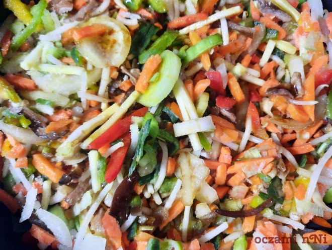 Dodać jeszcze dwie łyżki oleju i wrzucić do naszego aromatycznego tłuszczu pokrojone warzywa.