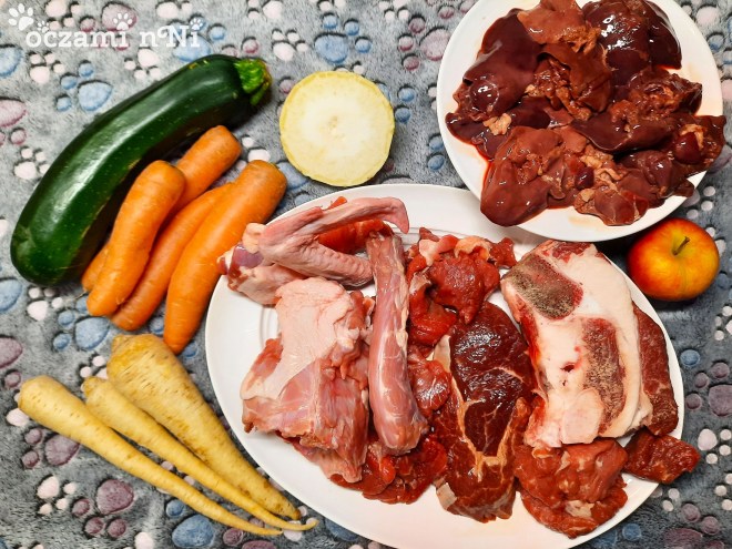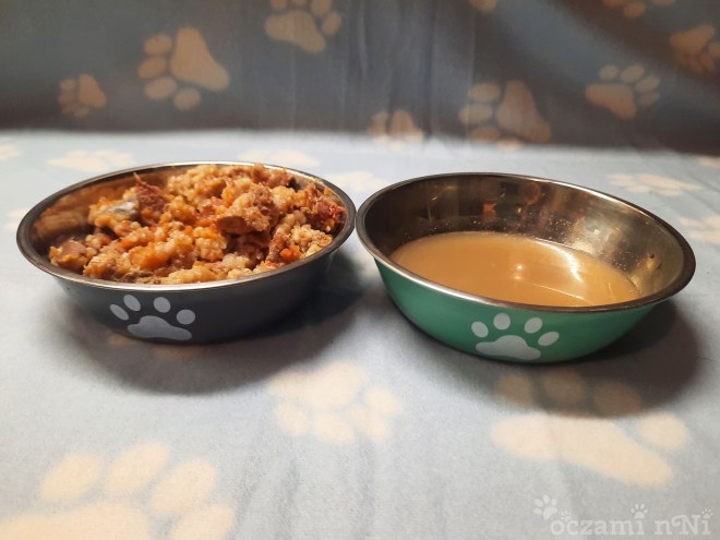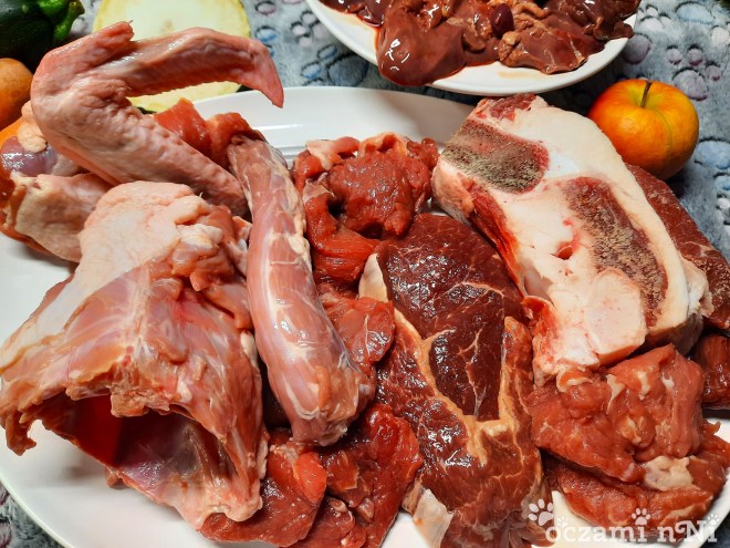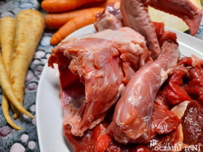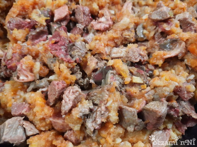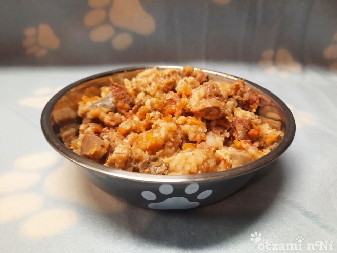 Sprawa ma się jednak inaczej z małymi dziećmi i zwierzętami. Pies potrzebuje w swojej diecie mięsa. Ucieszyłam się więc niesamowicie, że znowu będę mogła je od czasu do czasu gotować i mrozić porcje na cały tydzień (oprócz tego Żuli je też karmy z puszki, a także powoli uczy się jedzenia suchej karmy). Wiedząc, co jest wskazane i dobre dla niej, puściłam wodze swojej wyobraźni i wyczarowałam kilka aromatycznych karm. Zacznę od ostatniej!
