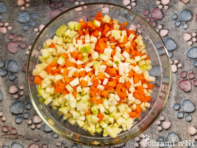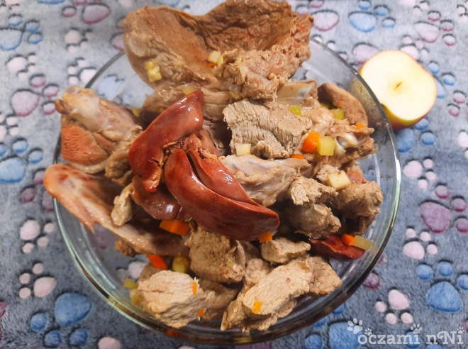 Ostudzone ugotowane mięso kroimy w dość małą kostkę. Z kaczki wyciągamy i wyrzucamy wszelkie kostki i chrząstki. Kawałki mięsa łączymy i mieszamy z ryżem, warzywami i jabłkiem. Całość dzielimy na porcje dzienne dla naszego pieska i zamrażamy na kolejne dni. Ja podaję jej porcję dzienną w dwóch ratach.