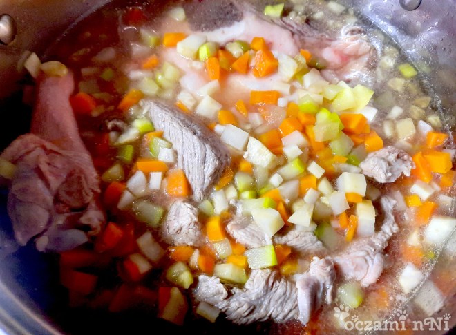 Z bulionu z garnka odlewamy połowę (i zostawiamy do ewentualnego podlania).
