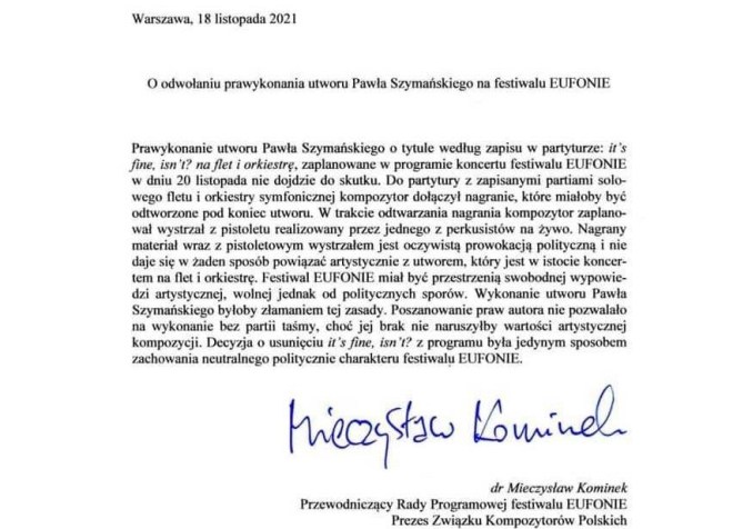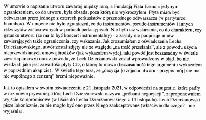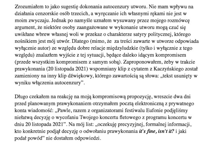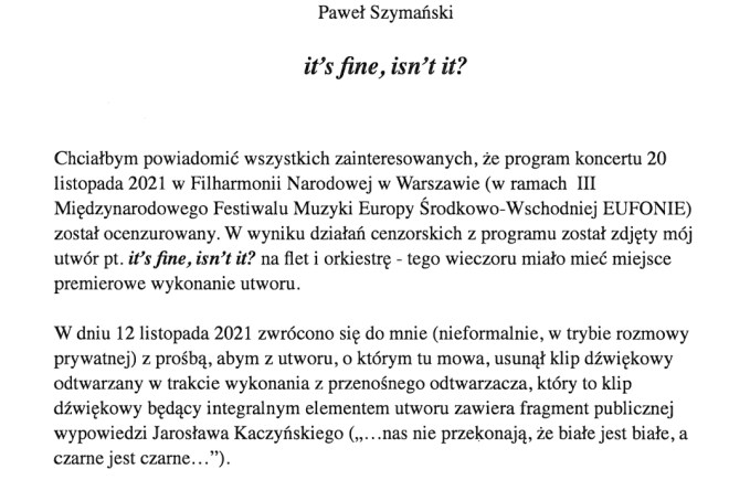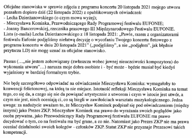 Kiedy przeczytałam stanowisko Związku Kompozytorów Polskich w sprawie wojny, nazywające napaść Rosji na Ukrainę „bandycką”, podpisane przez prezesa ZKP-u, zrobiło mi się niedobrze. Ten sam prezes jeszcze niecałe trzy miesiące temu, wykorzystał swoje stanowisko do ocenzurowania związkowego kolegi, wielkiego polskiego kompozytora Pawła Szymańskiego, wypełniając tym samym putinowski plan osłabienia krajów unijnych. Że bezmyślnie – co do tego nie mam wątpliwości, ale bycie marionetką w rękach proputinowskiej władzy nie zdejmuje z niego odpowiedzialności. Każda osoba oddająca w wyborach głos na partię obecnie rządzącą – proputinowską, anty-unijną – jest współwinna temu, co się dziś dzieje, mimo że całym sercem może być przeciwna tej wojnie. Choć wielu nie będzie chciało tej prawdy przyjąć, tylko osłabienie Unii Europejskiej (poprzez sukcesywne, wieloletnie osłabianie unijnych krajów od środka) otworzyło przed zbrodniarzem Vladimirem P. furtkę do rozpoczęcia wojny z Ukrainą. A ewidentnym osłabieniem państwa jest oddanie go w ręce zgrai nieobliczalnych dyletantów.