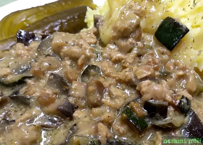 Pieczarki (które trzeba wcześniej umyć) i cebulę obrać oraz drobno posiekać, a potem wrzucić na rozgrzany na patelni olej z ziołami do momentu, kiedy cebula się zeszkli, a pieczarki będą podsmażone. Najlepiej, w trakcie smażenia, odrobinę posolić. Na końcu wrzucić roślinne mielone oraz granulat sojowy. Wszystko podlać niedużą ilością wrzątku, w którym rozpuścimy wcześniej 2 kostki grzybowe i dusić na wolnym ogniu ok. 10 minut. Bakłażana i cukinię pokroić w kostkę i piec z odrobiną soli w piekarniku (lub garnku do pieczenia) również na oleju ok. 20 – 30 minut. Wszystko razem – i duszone na patelni, i pieczone w piekarniku składniki – przełożyć do garnka. W rondelku rozpuścić niewielki kawałek masła, dodać do niego trochę mąki, wymieszać, a potem systematycznie dodawać sos z garnka, mieszając z serami. W razie potrzeby, dodać trochę wody. Jak uzyskamy gęsty, jednolity serowy sos bez grudek, dodać kilka kropli sosu sojowego i wlać całość do naszego garnka z resztą.
