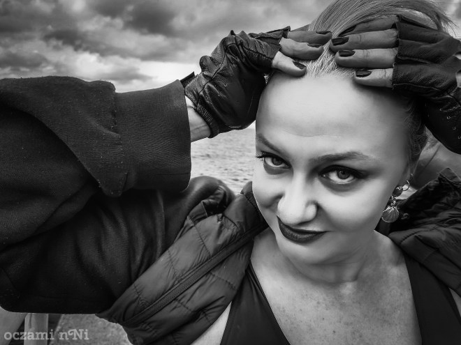 Prawdopodobnie już kiedyś pisałam o tym, że do ilustrowania blogowych wpisów własnymi sesjami zainspirował mnie dawny blog Fabjulus. Pamiętam, jakiego szoku doznałam, kiedy zobaczyłam jej zdjęcia. Jaki to był dysonans, że tak piękna kobieta może… tak doskonale i inteligentnie pisać. Przerażające, prawda? To również pokłosie patriarchalnego spojrzenia na kobiety i przydzielania im ról i wyglądów. Jak inteligentna, mądra i pisząca, to musi koniecznie siedzieć nieumalowana w worku po ziemniakach i tak sobie mędrkować. Nie może być ładna, a już na pewno nie zadbana i jeszcze do tego zgrabna. No, to się zwyczajnie ze sobą nie łączy. Przykładałam więc od początku, teraz chyba jeszcze bardziej świadomie, ogromną wagę do charakteru moich sesji, którymi ozdabiałam wpisy. Nie do mnie, rzecz jasna, należy interpretacja tego bloga, ale mogę zapewnić, że nie ma na nim elementów przypadkowych. [Może oprócz omawianego już kiedyś fatalnego łamania tekstu, na co – mimo wykupienia własnej domeny – nie mam ciągle żadnego wpływu.] Makijaże, stroje, paznokcie i rzęsy, a był czas, że nawet peruki, wielokrotnie pomagały mi tu wyczarować w mniej lub bardziej udany sposób jakąś dopełniającą wpis opowieść równoległą. Realizacja konkretnego pomysłu była dla mnie dużo ważniejsza niż to, żeby „wyglądać ładnie”. Jednak, jak każdy, mam zarówno własne poczucie estetyki, jak i swoje kompleksy, co powstrzymywało mnie od umieszczania tu jednych zdjęć i przekonywało do umieszczania drugich. W pewnym momencie złapałam się na tym, że sztuczne rzęsy i paznokcie (peruki były tylko chwilową fanaberią) stały się w mojej głowie obowiązkowymi rekwizytami w sesjach. To odkrycie uświadomiło mi, że wykreowałam w swojej własnej głowie taki obraz siebie, któremu nie dorównuję w rzeczywistości. I że nie jest to przemyślane blogowe alter ego, tylko kolejna pułapka. Od maja więc pokazuję na zdjęciach tylko własne paznokcie i rzęsy, trochę też ze względów terapeutycznych.